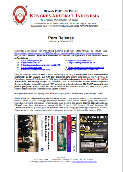yang isi beritanya memuat HOAX, tidak berimbang dan sangat memojokan serta merendahkan eksistensi Badan Hukum OA KAI dan pimpinan KAI dalam pelaksanaan PKPA & UPA di Palembang tanggal 6,7,8 Desember 2024 yang telah dilaporkan oleh Sdr.M.Aminudin, SH.,MH ke Polrestabes Palembang dengan No.:STTLP/B/276/I/ 2025/SPKT/Polrestabes Palembang/Polda Sumatera Selatan tanggal 25 Januari 2025 sebagaimana dimaksud pasal 378 KUHP tentang tindak pidana penipuan, karena DPP KAI belum menyerahkan sertifikat PKPA dan UPA kepada para peserta setelah sebulan terlaksananya kegiatan tersebut.