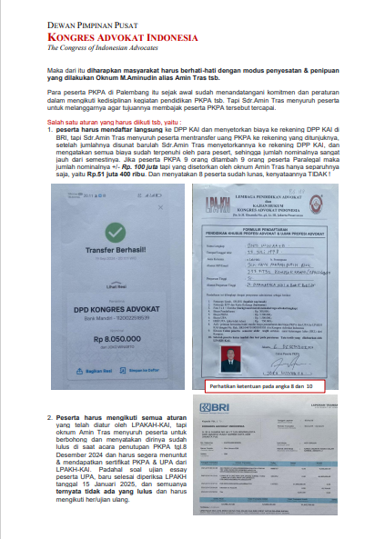 - peserta harus mendaftar langsung ke DPP KAI dan menyetorkan biaya ke rekening DPP KAI di BRI, tapi Sdr.Amin Tras menyuruh peserta mentransfer uang PKPA ke rekening yang ditunjuknya, setelah jumlahnya disunat barulah Sdr.Amin Tras menyetorkannya ke rekening DPP KAI, dan mengatakan semua biaya sudah terpenuhi oleh para pesert, sehingga jumlah nominalnya sangat jauh dari semestinya. Jika peserta PKPA 9 orang ditambah 9 orang peserta Paralegal maka jumlah nominalnya +/- Rp. 100 juta tapi yang disetorkan oleh oknum Amin Tras hanya separuhnya saja, yaitu Rp.51 juta 400 ribu. Dan menyatakan 8 peserta sudah lunas, kenyataannya TIDAK !