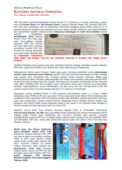 Berita hoax dan Ujaran kebencian yang diviralkan oknum Amin Tras khususnya tentang penipuan oleh DPP KAI karena tidak menyerahkan sertifikat PKPA & UPA pada peserta melalui media online, media cetak, medsos dan akun YouTube miliknya itu berikut ucapan kebencian (hate speech) dan pencemaran nama baik terhadap institusi badan hukum OA DPP KAI dan terhadap nama baik Presiden DPP KAI, sudah direspon oleh Bareskri Bareskrim Mabes Polri pada tanggal 6 Pebruari 2025.